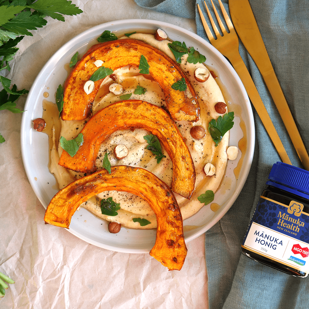 Manuka Honig schmeckt nicht nur pur vom Löffel hervorragend, sondern kann auch als natürliches Superfood-Süßungsmittel verwendet werden! Wir haben ihn dieses Mal mit herbstlichem Ofenkürbis und cremigem Hummus kombiniert. Einfach nur lecker!