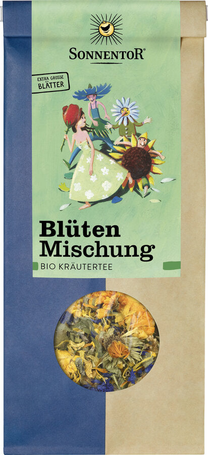 Erleben Sie den Geschmack einer blühenden Sommerwiese in jeder Tasse – mit dem Blütenmischung Tee lose von Sonnentor!